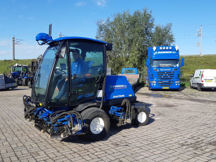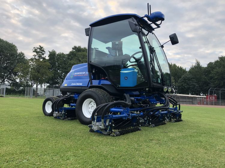 K. Groenenboom besloot dan ook om de John Deere 8900A definitief aan te schaffen. In de zomer van 2020 werd de machine afgeleverd. Het is voor Kraakman de eerste levering van dit model in Nederland, vertelt accountmanager Bart Perfors. 'Voorheen had John Deere de vijfdelige kooimaaier 1905, maar daar zijn ze mee gestopt. Dit is de eerste 8900A-fairwaymaaier in Nederland in deze uitvoering, dus met tier 5-motor en een maaibreedte van 2,90 meter.' De 8900A van Groenenboom is wel iets anders dan de standaard fairwaymaaier. Perfors: 'Er zit een John Deere gps-systeem op, een cabine van Mauser die we er zelf op gebouwd hebben, en de kleur is natuurlijk anders: hij is volledig in de bedrijfskleur van K. Groenenboom bv, namelijk blauw. Zo compleet hebben we hem nog nooit gehad. Dit is wel één van de compleetste maaiers die in Nederland rondrijden.'