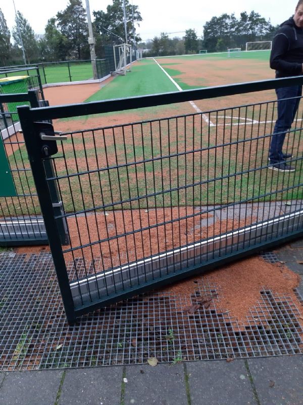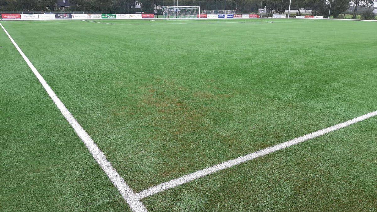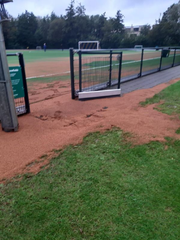 Op onderstaande foto's is het verschil goed te zien. Links het veld van Alliance in Haarlem met de nieuwe mat, rechts een veld in Velsen waar kurk uitgespoeld is.