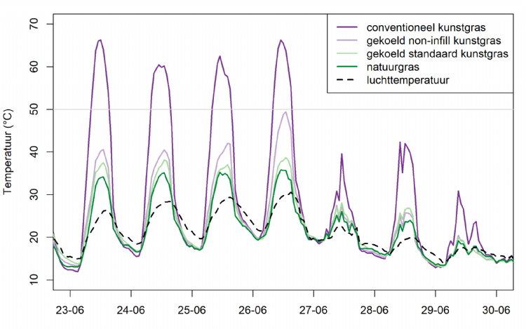 Ander onderzoek (Petras et al., 2014) laat zien dat de opwarming behalve aan klimatologische condities (straling, luchttemperatuur en luchtvochtigheid) ook gerelateerd is aan het type infill, de shockpad en aan de warmteoverdracht van de kunstgrasvezelrug aan de shockpad. Aanpassingen van de infill (o.a. andere albedo) leveren echter vooralsnog slechts beperkte verbeteringen op ten opzichte van conventionele systemen. Uit meerdere onderzoeken (Penn State, 2015; Kanaan et al., 2020) blijkt dat verdamping de enige effectieve manier is om kunstgrasvelden te koelen. Vooralsnog wordt dit vormgegeven door de beregening van sportvelden. Een probleem hierbij is echter dat het verkoelende effect van beregening in veel gevallen te kort duurt, het de speeleigenschappen negatief beïnvloedt en dat hiervoor grote hoeveelheden (drink)water nodig zijn.