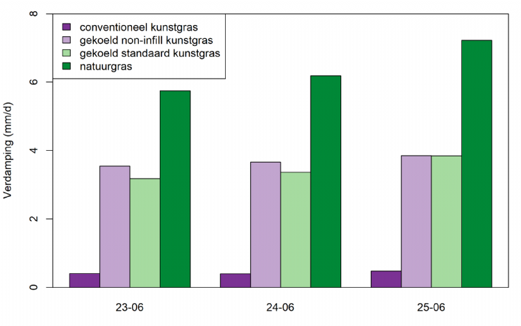 Wat opvalt in diezelfde periode is dat het gekoelde kunstgras ongeveer de helft minder water verdampt dan gewoon gras, maar veel meer water dan conventioneel kunstgras. Het is bemoedigend dat de temperatuur met de helft aan water 25oC kan worden verlaagd.