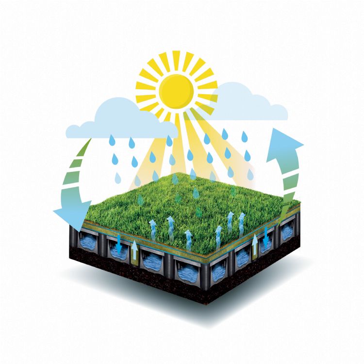 De kern van de ontwikkelde innovatie is het tijdelijk opslaan van infiltrerend regenwater in een holle (Permavoid-)fundering, direct onder de capillair werkende (BlueLay-)shockpad van het kunstgrasveld. Vervolgens wordt dit water teruggevoerd naar het oppervlak voor verdamping, zodat het veld gekoeld wordt op hete dagen (afbeelding 1). Het tijdelijk bergen en weer terugvoeren van water naar de zand-infill voor verdamping is uniek ten opzichte van andere systemen, die zich alleen richten op de opslag en eventuele zuivering van overtollig regenwater bij sportvelden of op de energetische eigenschappen van infills en kunstgrasvezels. Met het ontwikkelde systeem wordt wateroverlast bestreden door het vasthouden en verdampen van overtollig regenwater en wordt tegelijkertijd invulling gegeven aan de vereiste watercompensatie op locatie.