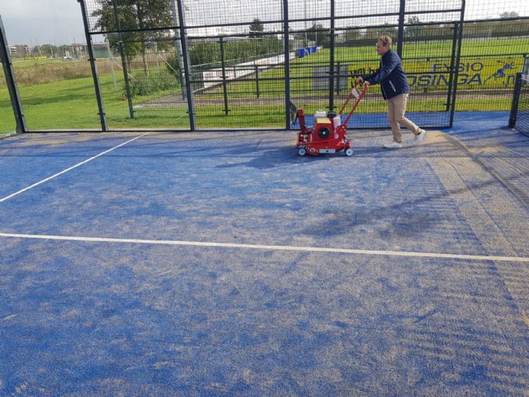 Willem Hak van Van Leeuwen Landbouw-, tuin- en parkmechanisatie nam het voortouw om samen met Wijnbergen Sportbouw het gebruik van de SMG Turfsoft TS2/TS3 te demonsteren voor Padelfactory. 'Deze machine is ontworpen om kunstgras met en zonder infill te reinigen en te onderhouden', vertelt Hak. 'De machine heeft een werkbreedte van 80 centimeter. Qua onderhoud spreken we over het verwijderen van pluis van ballen, losgeraakte kunstgrasvezels, menselijke haren, maar ook takjes, eikels, flessendopjes, stof, pollen en ander organisch materiaal. Zo'n padelkooi, met een oppervlak van circa 200 vierkante meter, is eigenlijk te klein om goed in te kunnen manoeuvreren met een minitractor en werktuigen. Ook de netpaal, die vaak net voor het toegangshek van het veld staat, maakt het aannemers met brede machines moeilijk om op een padelveld te komen. Deze machine is hiervoor een uitkomst en vormt een perfecte oplossing om zand- en zand-rubberinfill te reinigen op kleine oppervlakken.' Met deze goed manoeuvreerbare reinigingsmachine van SMG kun je heel gemakkelijk door deuropeningen rijden en langs stoepen of smalle gangen om een kunstgrasveld te bereiken. Met een gewicht van 85 kilo kunnen twee sterke mannen de machine over lage hindernissen tillen; daarvoor zitten er zelfs handvatten aan. De afmetingen van de machine zijn 800 x 1.000 x 570 millimeter.
