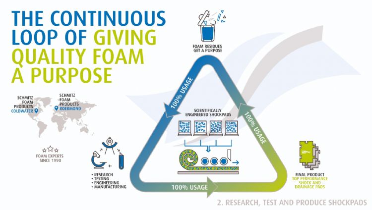 Bij Schmitz Foam Products staat milieu hoog in het vaandel. Door overtollige foamproducten een nieuwe kans te geven, voorkomt Schmitz Foam Products dat jaarlijks enkele tonnen aan foam als afval wordt afgeschreven. Zowel in de fabriek in Roermond als in Coldwater in de VS, gebruiken experts de meest modern technieken om de verschillende soorten foam te scheiden en deze klaar te maken voor productie van een shockpad. Schmitz Foam Products doet dat al sinds eind jaren '80 en heeft daarvoor verschillende kwaliteitsprotocollen en productieprocedures nauwkeurig vastgelegd. Naleving daarvan wordt regelmatig gecontroleerd door auditors, die jaarlijks komen vaststellen of Schmitz Foam Products nog altijd aan de eisen voor de ISO 9001 en CE certificering voldoet.