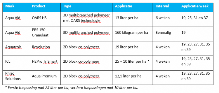 De producten zijn exact volgens het advies van het etiket toegepast, zowel in liters per ha als interval. Zie onderstaand schema voor een overzicht van alle producten uit deze praktijkproef.
