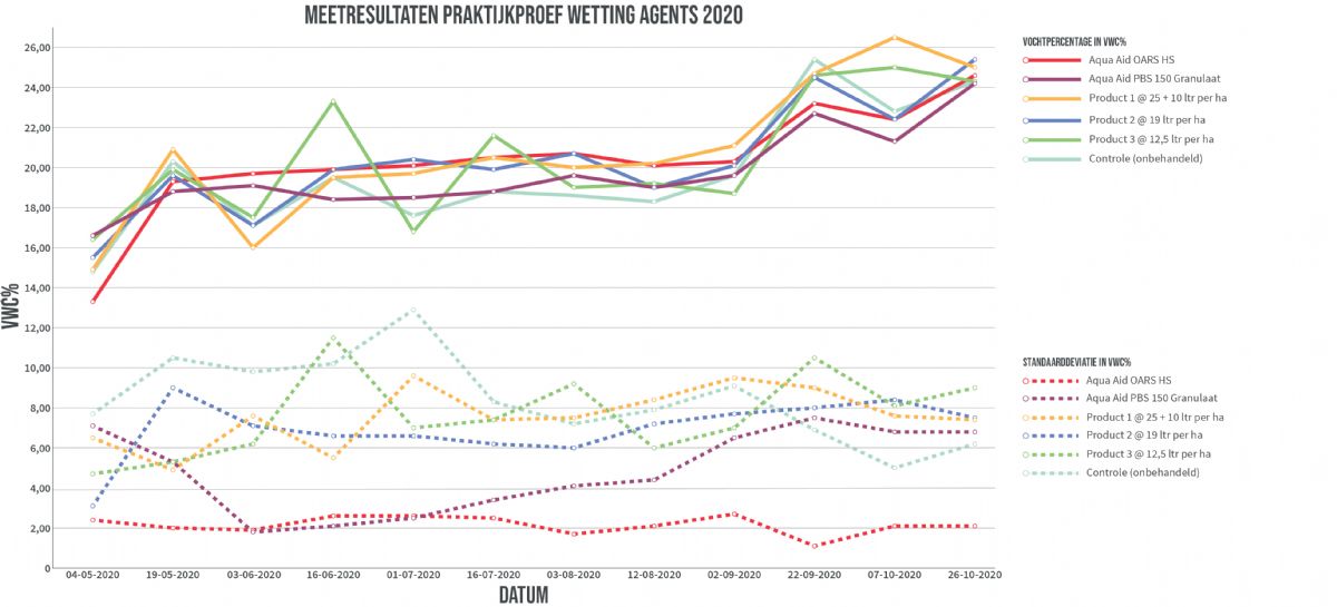 - Hogere bodemvochtbalans met wetting agents. Alle wetting agents zorgen voor een significant hogere bodemvochtbalans ten opzichte van de onbehandelde controleplots. - OARS HS scoort beste op gemiddeld VWC%. Over de gehele testperiode scoort OARS HS gemiddeld het hoogste in de gemeten vochtpercentages. Daarnaast blijven de gemeten vochtpercentages gedurende de hele periode stabiel zonder pieken. Bij onder andere Aqua Premium en Revolution stijgen de vochtpercentages aanzienlijk na iedere toepassing. - OARS HS is erg uniform in VWC%. De spreiding in meetwaarden (hoogste en laagste meting binnen de plots) is bij OARS HS kleiner dan 1%. Dat wil zeggen dat bij een gemeten vochtpercentage van 23% de laagste waarde 22% is en de hoogste 24%. Het bodemvochtpercentage is dus over de gehele testperiode stabiel en wijzigt niet bij een toepassing, na een regenbui of droogteperiode. Stress in de grasplant wordt hierdoor tot een minimum beperkt. - Langere werking van OARS HS. Aangetoond is dat de werkingsduur van OARS HS minimaal 6 weken is, de werkingsduur van alle andere producten is maximaal 4 weken. OARS HS haalt deze duurwerking zelfs bij een dosering van 13 liter per ha (laagste dosering van alle producten). In totaal zijn dus slechts 4 toepassingen noodzakelijk, tegenover 6 bij de andere producten. Een besparing in liters product én arbeidskosten. - OARS HS werkt prima in lagere dosering. 4 toepassingen van 13 liter is totaal slechts 52 liter product. Bij 6 toepassingen van Aquapremium kom je uit op 75 liter en bij 6 toepassingen Revolution kom je op 114 liter product per ha. - Bij nauwkeurig vochtgedrag kan watergebruik met 35% omlaag. Eerdere studies (uitgevoegd door Penn State University) naar de werking van OARS HS, lieten al zien dat nauwkeurig en uniform vochtgedrag kan leiden tot een verlaging van watergebruik tot wel 35%. Dit praktijkonderzoek bevestigt deze bevinding.