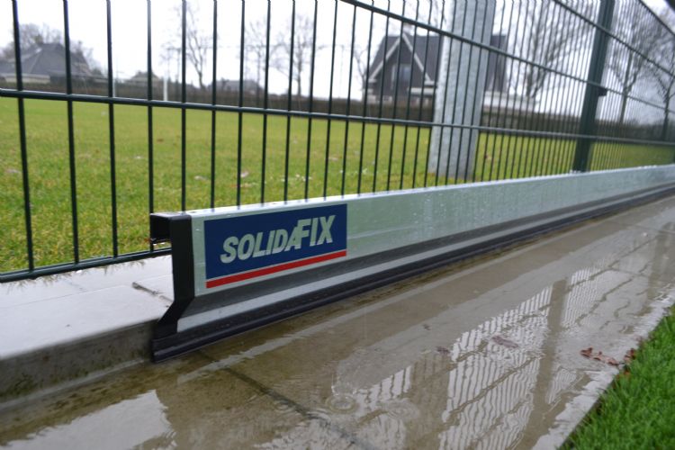 Solidafix maakt de aluminium planken met een hoogte van 8 of 20 cm. Staal is met alle hoogtes te maken. Van Wanrooij: 'Onze stalen plank wordt thermisch verzinkt. Alle bevestigingsmiddelen zijn thermisch verzinkt of van rvs, afhankelijk van de toepassing. Het aluminium profiel wordt geëxtrudeerd; behalve het extrusieprofiel maken we alles zelf.' Ook het aluminium systeem heeft dezelfde rubberstrip aan de onderkant en kan gemonteerd worden op hekwerk of geïnstalleerd worden op reclameborden. Bij de plaatselijke voetbalvereniging in Vinkel, EVVC, heeft Solidafix rond een kunstgrasveld een aantal proefopstellingen gerealiseerd. De eerste velden van 2021 worden binnenkort geplaatst. In Strijen wordt een veld met de aluminium kantplank uitgerust door CSC, in Gilze en Rijen staan er drie velden op de planning door Antea.