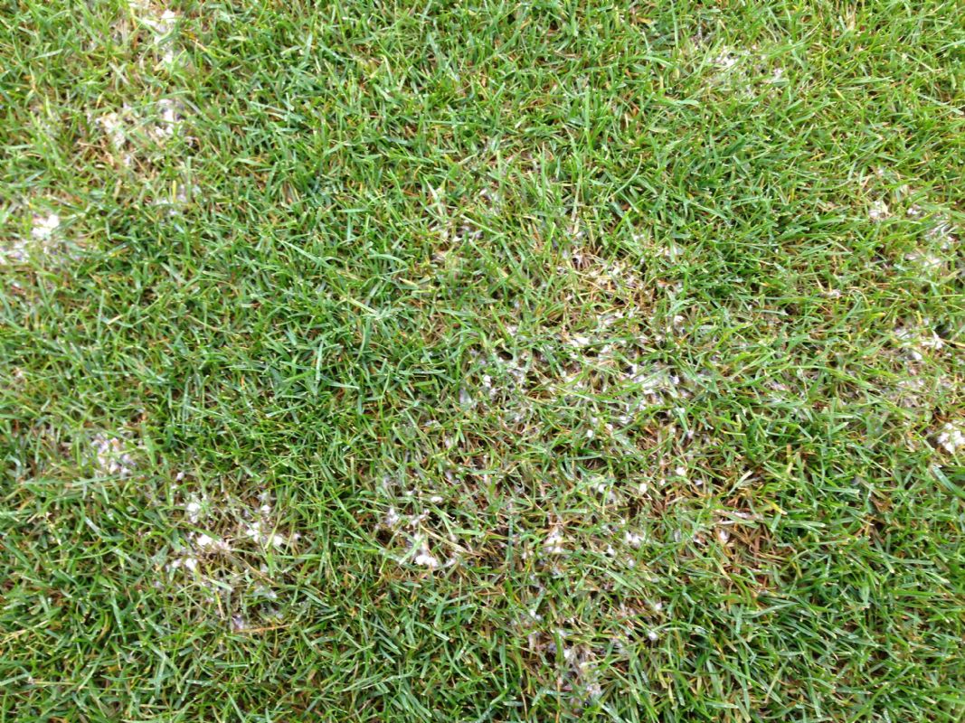 Omdat er niet gespeeld wordt op de velden, kan straatgras zich vestigen in de mat (links); mogelijke schade door vorst en sneeuw is het ontstaan van sneeuwschimmel.