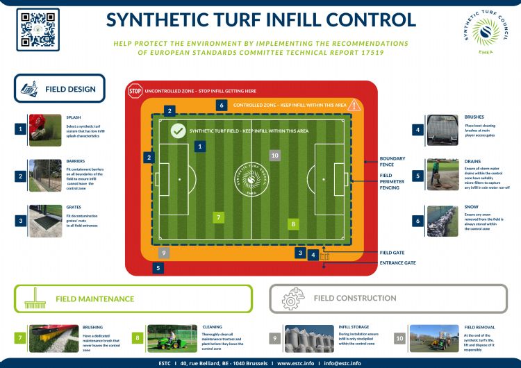 ESTC heeft een poster gepubliceerd met tien belangrijke punten waarmee infill van 3G-kunstgrasvelden in het veld kan worden gehouden. De poster moet veldeigenaren en onderhoudsmedewerkers helpen om verbeteringen aan te brengen en daarmee de milieu-impact van het veld te verminderen.