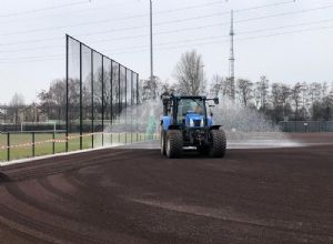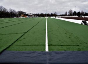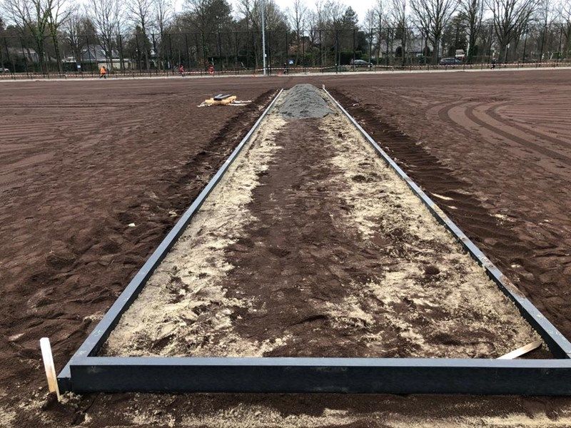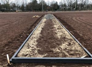 CSCsport•Greenfields stond dus direct in de startblokken om met het werk te beginnen zodra dat mogelijk was. Begin januari stelde de rechter ASC in het gelijk en bleef de vergunning geldig. Jorn Rommens, namens de aannemer betrokken als uitvoerder, vertelt: 'Het is daarna ontzettend snel gegaan. Wij zijn in week 3 begonnen met kleine opruimwerkzaamheden, en een week later begonnen met afgraven. AH Vrij heeft voor ons als onderaannemer een laag van 30 cm afgegraven en afgevoerd. Op die constructie is 10 cm nieuw zand gekomen en een laag van 10 cm Lava 05. Daar komt een foam-laag op, van Trocellen, en daar leggen we vervolgens de mat op aan. De hele constructie zakt ongeveer 5 cm ten opzichte van de oude situatie.'