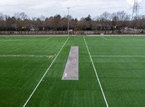 Het veld wordt verder voorzien van kantplanken van gerecycled kunstgras, geleverd door Duvano uit Oss, en waar nodig past Hekbouw de hekwerken aan. Tussen de twee velden lag een uitloopzone waar nu ook kunstgras komt te liggen. In het midden daarvan ligt de cricket-pitch. Rommens: 'Eerder was alleen de cricket-pitch van kunstgras, nu de uitlopen dus ook, omdat hier een actieve cricket tak speelt. We hebben rond de pitch speciale kunststof banden geplaatst, geleverd door Tamminga Sports, waar we de mat op kunnen bevestigen. Verder zijn de voetbalvelden ook het speelveld voor de cricket - hier hoefden we geen belijning voor aan te passen.'