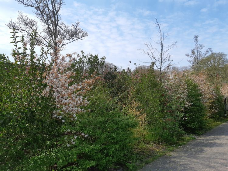 Langs één van de velden ligt geen verharding, maar een perk struiken en groen.