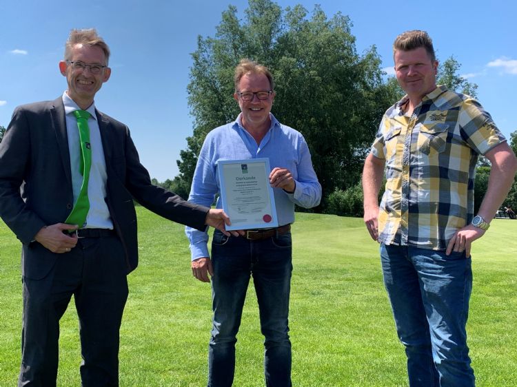 | Uitreiking van het certificaat door Dick Oosthoek (Groenkeur) aan Hans Schaap en Roelof Scherff (beiden HSM). |