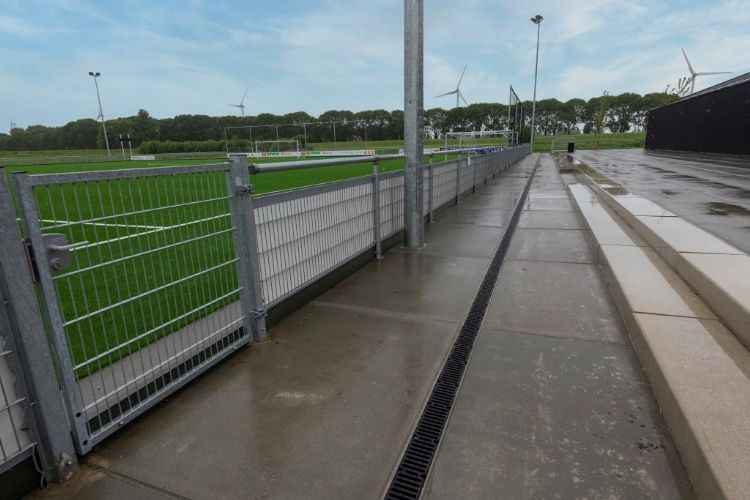 Op het gehele sportpark liggen betonplaten van Zwaagstra Beton. 'Vanwege de uitstraling is gekozen voor platen van 2 bij 1 meter', zo licht Groeneveldt toe. 'Dat oogt het mooiste. De toplaag is voorzien van een richtingloze antislipstructuur. Zo is het onder alle weersomstandigheden veilig om hier te lopen.' Het leveren en leggen van het grote aantal platen was een project op zich. 'Ze liggen vrijwel overal, ook rondom de velden. Van oktober 2019 tot en met januari dit jaar werden er continu betonplaten door Zwaagstra Beton aangevoerd. Iedere week werd er geleverd. Zodra Zwaagstra een partij klaar had, werden de platen gebracht. Er zijn niet veel leveranciers die dat op zo'n korte termijn en in zo'n snel tempo kunnen.'