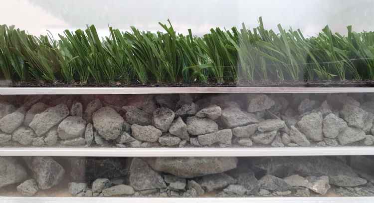 | Doorsnede van de WaBu-fundering onder een kunstgrasveld |