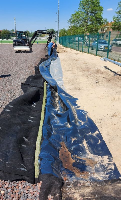 Een klimaatadaptief veld met waterberging is op een aantal manieren te realiseren. Bij dit project werd niet gekozen voor een krattensysteem, zoals in Amsterdam, of een grauwacke- of Waber-systeem. Van Schaik: 'Een krattensysteem is mooi, maar je moet er wel een heel vlakke basis voor hebben. Het is vrij kwetsbaar.' Gras Advies ging in het voortraject in overleg met producent Low & Bonar om een alternatief idee uit te werken. Avéres: 'Wij hadden het idee om een soort waterbergende badkuip te bouwen onder het veld. Bij andere systemen is het de waterberging die infiltreert; in dit systeem is waterdichte folie als een soort badkuip in het cunet gelegd. Daarop is vervolgens een EnkaDrain ZB 350 aangebracht, die een vierledige functie heeft: als filter, als waterbuffering, voor de bescherming van de waterdichte folie en voor de afvoer van overtollig water. De waterbergende laag bestaat uit 270 mm lava 16/32, met daarop een geotextiel en een sporttechnische laag van 70 mm lava 0/8.'