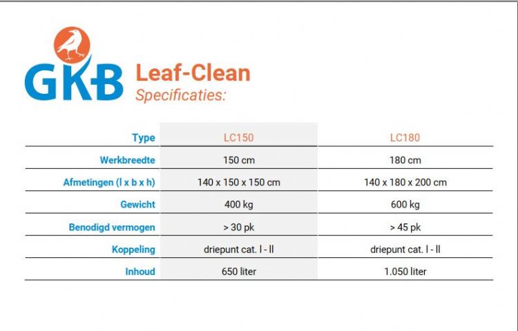 De kunststof borstelsets hebben lange haren, die spiraalsgewijs bevestigd zijn aan een hydraulisch aangedreven rotor. De ventilator die voor de benodigde zuigkracht zorgt, is rechtstreeks aangesloten op de aftakas van de tractor en maakt circa 1.000 rpm. De Leaf-Clean kent twee uitvoeringen. De LC150 heeft een werkbreedte van 150 cm en een opvang van 650 liter. De grotere LC180 neemt bij elke werkgang 180 cm mee; hier heeft de opvangcontainer een capaciteit van 1.050 liter. Het legen van een volle container gaat heel eenvoudig. Door middel van een hoogkiepfunctie kan de bestuurder het verzamelde blad in een daarvoor bestemde afvoercontainer werpen.