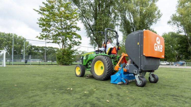 De sportvelden van de gemeente Alphen aan den Rijn liggen verspreid over een vrij groot gebied. Vanaf de gemeentewerf tot aan de Boskoopse sportvelden is het circa 12 km. De Leaf-Clean wordt daar uiteraard per tractor naartoe vervoerd, in dit geval een Boomer met 42 pk, die op de weg lekker snel uit de voeten kan. Bos zegt dat hij vooral veel profijt heeft van zijn machine op een reeds 40 jaar bestaand sportpark, doorkruist door wandelpaden: 'Hier zijn destijds veel bomen aangeplant en worden ook bomen vervangen. Het is er prachtig. We hebben dus ook wel hinder van bladval in de herfst. Daarbij liggen drie van de 27 velden pal naast een dubbele rij populieren. Als je 's ochtends het blad ruimt, kun je 's middags opnieuw beginnen. Dagelijks zijn er dan ook twee man in de weer met deze machine. De verenigingen bespelen de kunstgrasvelden intensief; een keer overslaan is dan ook geen optie. Tenslotte betalen de verenigingen voor schone, veilig bespeelbare velden.' Bos noemt de machine breed inzetbaar. Dit was een argument voor de aankoop na een demonstratie van GKB. 'Maar ook de degelijkheid die hij uitstraalt', zegt Bos. 'En er was nog een argument. De mogelijkheid om het blad met een hoogkieper direct in een afvoercontainer te storten. Nu kunnen we bladafval nog als restafval afvoeren, maar ik moet bekennen dat er nog weleens een opgezogen korrel rubber meegaat. Ik maak me er zorgen over dat we het in de toekomst als chemisch afval moeten afvoeren.'