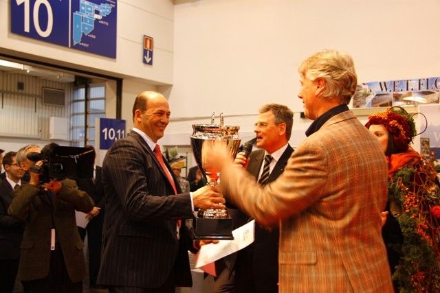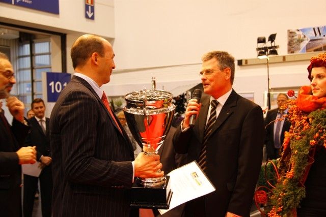 Egon Galinnis (directeur Messe Essen) spreekt de winnaar toe.