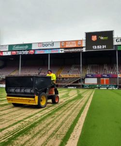 Ook CSC is daar trots op, vertelt Ceelen. 'Het is mooi dat we dit al voor de vierde keer voor FC Volendam doen. Daar blijkt ook wel uit dat er wederzijds veel vertrouwen in elkaar is. We merken dat ook in de hele samenwerking met de club. Er is veel ruimte voor afvoer en opslag van materialen, we krijgen hulp van vrijwilligers en de club stelt zelfs het supportershome ter beschikking. Het is heel prettig werken.' Al die factoren bij elkaar zorgen ervoor dat het voor CSC mogelijk is om zich aan de strakke planning te houden. Ceelen: 'We hebben dit project goed kunnen voorbereiden, dan is het te doen om in 8 tot 10 werkdagen een nieuw veld aan te liggen. Als het weer ook mee zit, komt hier een super mooi veld te liggen. Daar doen we hard ons best voor.'