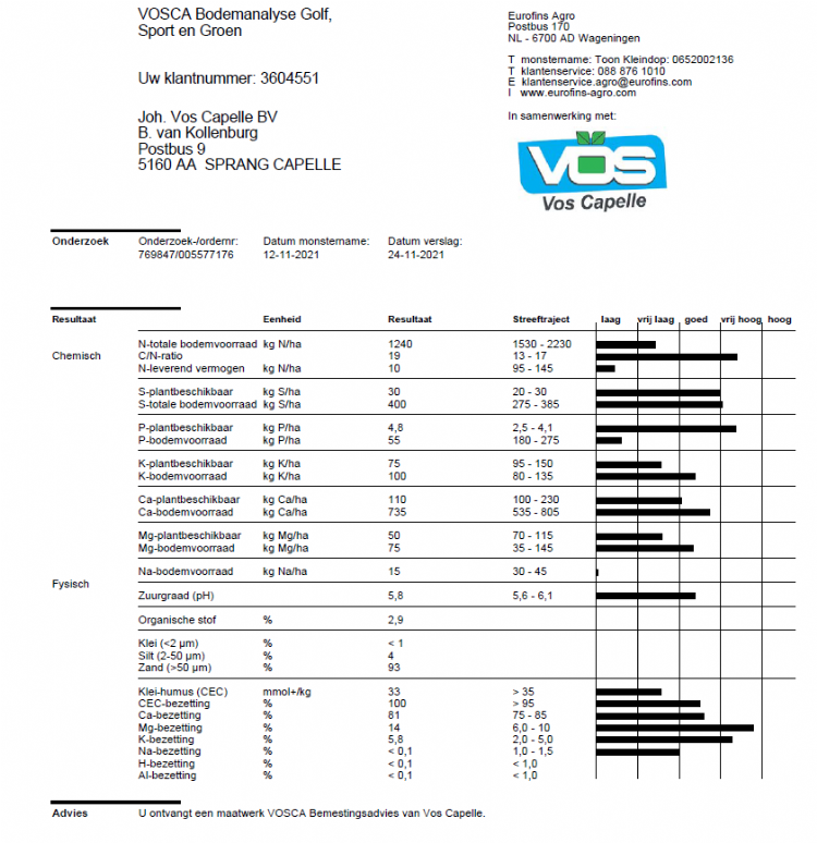 In samenwerking met Eurofins Agro ontwikkelde Vos Capelle een eigen bodemanalysepakket: VOSCA bodemanalyse sport & groen. Deze compacte en praktische analyse is speciaal ontwikkeld voor fieldmanagers, greenkeepers en hoveniers en bevat alleen díe parameters die echt nodig zijn voor het maken van een bemestingsprogramma voor een golfbaan, sportveld, gazon, border, plantsoen of park.