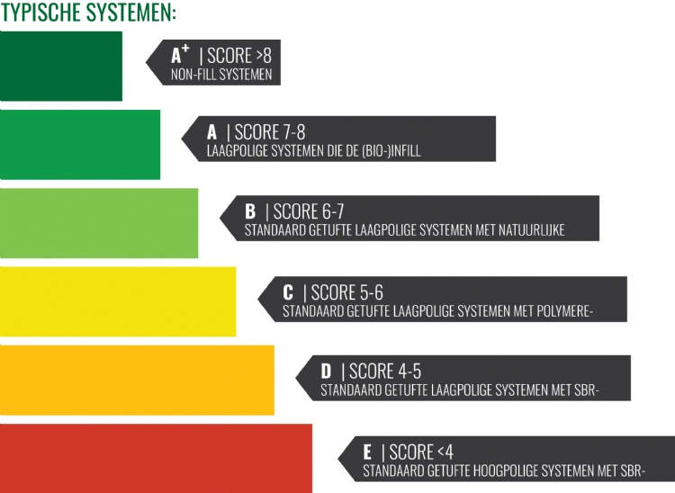 Die labels presenteert dit dochterbedrijf van Ten Cate Grass onder de noemer Greenfields Ecorange. De beoordeling gaat van het E-label voor de relatief minst duurzame oplossing tot het A+-label voor de meest duurzame optie. Het is dan verder aan de opdrachtgever om te kiezen, verklaart Rutger Schuijfel van CSC Sport.