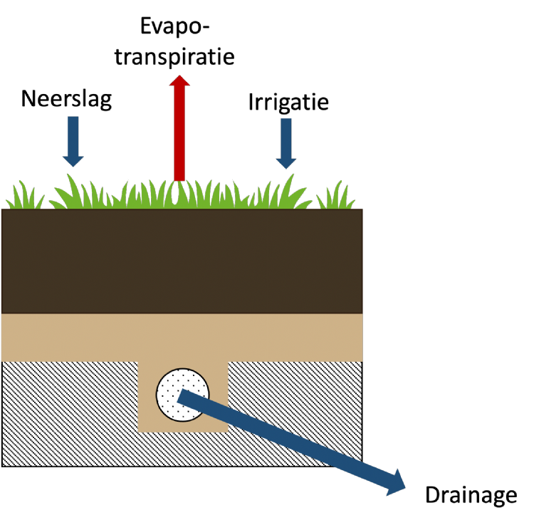 Neerslag is de regen die valt. Bodemdeeltjes kunnen dit regenwater aan zich binden. Na een lange regenbui raakt de grond verzadigd. Irrigatie: Wanneer er een neerslagtekort is, kan men irrigeren om het veld van water te voorzien. Een teveel aan water zal echter uitspoelen. Dat is zonde van het water, maar geeft bovendien het risico dat meststoffen en pesticiden uitspoelen. 'Door de irrigatie te optimaliseren, kan de uitspoeling naar nul worden gebracht', aldus Thomas Evers. Een waterretentiecurve geeft het verband weer tussen het vochtgehalte van de bodem en de zuigspanning (pF): hoe groter de kracht waarmee water aan bodemdeeltjes wordt gebonden, hoe hoger de zuigspanning (de kracht waarmee een wortel water uit de bodem kan opnemen). Het opneembare vocht is de hoeveelheid water die tussen het verwelkingpunt van het gras en de veldcapaciteit in zit (de hoeveelheid water die in een goed ontwaterde bodem achterblijft nadat overtollig water is uitgezakt). Om stress in de plant te voorkomen, wordt aangeraden het vochtgehalte in de bodem niet te laten dalen tot het verwelkingspunt, maar al eerder water te geven. Dit punt is afhankelijk van de grassoorten op een veld. Evapotranspiratie is een combinatie van evaporatie (verdamping van water aan het aardoppervlak) en transpiratie (verdamping van water uit planten). Verdamping vanuit de bodem komt met name door de straling van de zon. Verdamping uit planten verloopt via zogenaamde huidmondjes. Via deze huidmondjes kan de plant ook koolstofdioxide uit de lucht opnemen en zuurstof uitstoten. Elke plantensoort heeft zijn eigen gewasfactor, waarmee de verdamping kan worden berekend. Tussen verschillende grasrassen zit een (klein) verschil; het ene ras heeft een lager waterverbruik en/of is hitteresistenter dan het andere. Drainage: Als er meer neerslag valt dan er verdampt, zal een deel via drainage (ontwatering) wegspoelen. Dit kan via natuurlijke weg, of door drains die zijn aangelegd. De k-waarde (in m/etmaal) geeft de waterdoorlatendheid van de bodem weer; hoe lager het getal, hoe slechter de doorlatendheid.