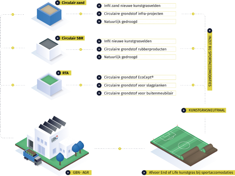 Circulair zandBij de aanleg van een nieuwe kunstgrasmat is infillzand nodig voor de stabiliteit van de mat. Dit infillzand moet van een specifieke en hoge kwaliteit zijn. Het circulaire infillzand van GBN-AGR voldoet aan de sporttechnische NOC-norm NSF M4a. Milieutechnisch voldoet het infillzand aan het Besluit bodemkwaliteit, zodat het verantwoord en veilig toegepast kan worden in nieuwe sportvelden.Het circulaire infillzand is ook geschikt als circulaire grondstof in bijvoorbeeld betonproducten, of als drainagezand voor infraprojecten. Circulair SBR-rubbergranulaatAls performance-infill in kunstgrasvelden wordt veel gekozen voor SBR-rubbergranulaat. Het rubber uit de EoL kunstgrasmatten is na het recyclingproces van GBN-AGR geschikt voor een volgend leven. Het materiaal vindt zijn weg in nieuwe kunstgrasvelden of als circulaire grondstof in diverse nieuwe rubberproducten. Denk aan rubbertegels, antislipmatten, reclaimed rubber compounds, waterretentiepanelen en meer.Kiest u voor een veld zonder rubber infill? Dan kunt u voor een andere toepassing kiezen, bijvoorbeeld rubber waterretentiepanelen op een groendak in uw gemeente of op de sportaccommodatie zelf. Recycled turf agglomerate (RTA)De uitgeklopte kunstgrasmat is verwerkt tot een agglomeraat: RTA. Dit is als circulaire grondstof geschikt voor duurzame kunststofproducten. Denk aan kantplanken langs een veld, een picknicktafel bij de kantine of een mooie plantenbak om de accommodatie te verfraaien. Het kan allemaal worden gemaakt van het kunstgrasveld waarop de leden van de vereniging eerst hun duellen uitvochten!RTA kan ook worden ingezet voor Ecocept. Dit is een duurzame en innovatieve sporttechnische laag, ontwikkeld voor de performance van kunstgrasvelden. Samen naar kunstgrasneutraalDoor onze circulaire grondstoffen van uw end of life kunstgrasvelden in te zetten op úw sportaccommodatie, sluiten we samen de keten. Wij geven de EoL kunstgrasmat een tweede leven en ú kunt deze een nieuw bestaan geven. Laten we samen werken aan de circulaire economie en de sportaccommodaties in Nederland kunstgrasneutraal maken.Wilt u graag weten hoe ú kunstgrasneutraal kunt worden? Wij gaan graag met u in gesprek!