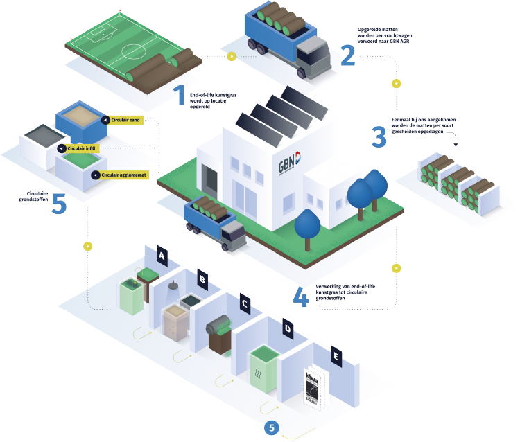 Een goed begin is het halve werkCirculair handelen begint met een goede voorbereiding. Op het moment van aanbesteden kunt u al bewuste keuzes maken. Bijvoorbeeld door circulair infill voor te schrijven in plaats van virgin infill. Of door circulaire kantplanken van gerecycled kunstgras toe te passen in plaats van tropisch hardhout of aluminium. In de aanbestedingsfase kunt u eveneens berekenen hoeveel ton 'afval' er zal vrijkomen bij het verwijderen van het end of life (EoL) kunstgras en bepalen hoe u dit een nieuw leven kunt geven. Is er vraag naar waterretentiepanelen of circulaire damwandbeschoeiing elders in uw gemeente? Het zijn zomaar een paar mogelijkheden om uw end of life kunstgras circulair te maken.VijfstappenplanDe levensduur van een kunstgrasmat is ongeveer tien jaar. Tot een paar jaar geleden was er geen verantwoorde manier om deze EoL matten af te voeren en te verwerken. Dit leverde veel hinder op voor gemeenten, leveranciers en aannemers. Gelukkig behoren deze zorgen sinds de start van GBN-AGR tot het verleden.Het afvoeren van uw EoL kunstgrasmat verloopt in vijf overzichtelijke stappen: 1. Het kunstgrasveld wordt inclusief infill opgerold tot verwerkbare rollen. Dit is een specialistische klus, omdat de onderbouw van het kunstgrasveld vaak wordt hergebruikt en de rollen netjes opgerold moeten worden om ze goed te kunnen verwerken in het recyclingproces. 2. De rollen worden vervolgens afgevoerd in gesloten vrachtwagens. De transporteur is in het bezit van de juiste vergunningen om het oude kunstgras(afval) te transporteren. 3. Bij de recyclingfabriek van GBN-AGR worden de matten per soort gescheiden opgeslagen. Op deze locatie hebben wij alle voorzieningen om kunstgras volledig en verantwoord te recyclen. Zo is het hele terrein voorzien van een vloeistofdichte vloer, een 4 meter hoge omheining en zelfs een waterzuiveringsinstallatie. De locatie is volledig vergund en is dus een erkende verwerkingslocatie. Nu gaat de verwerking beginnen! Het infill (zand en rubber) wordt gescheiden van de EoL kunstgrasmat. Dit gebeurt in de zogenoemde 'mattenklopper'. Het mengsel van zand en rubber gaat vervolgens door de wasinstallatie, waar de twee materialen met water worden gescheiden en gereinigd. Dit natte proces is een bewuste keuze. De velden die bij ons binnenkomen, zijn gemiddeld tien jaar oud. In tien jaar tijd kan het infill verontreinigingen uit de omgeving en/of door uitloging hebben opgenomen. Na het reinigingsproces blijven er voor ruim 99,9 procent zuivere grondstoffen over. Hierdoor ontstaat onder meer circulair infillzand dat volledig vrij is van microplastics en andere chemische stoffen. Ontdaan van fijne deeltjes en overige verontreinigingen voldoet het weer aan de vereisten '(schoon) conform het Besluit bodemkwaliteit'. Het performance-infill is geschikt voor een volgend leven! De uitgeklopte kunstgrasmat wordt verder verwerkt door deze te verkleinen, te zeven en te agglomereren. 4. De circulaire grondstoffen worden na een interne kwaliteitscontrole ook extern geanalyseerd en gecertificeerd. Het unieke verwerkingsproces van GBN-AGR is bekroond met het KIWA Innovatiecertificaat voor Kunstgrasrecycling.