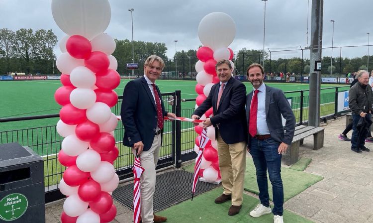 | Namens hoofdsponsor Markel verrichtte Bob Dorhout Mees de opening van het nieuwe waterveld door samen met de voorzitter en de penningmeester van AMHC Rood-Wit een lint door te knippen. |