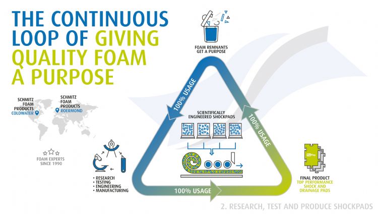 Het merendeel van de producten is gemaakt van schuim dat oorspronkelijk geproduceerd werd voor toepassingen in industrieën zoals de auto-, verpakkings- en sportindustrie en de bouw. Als Schmitz Foam Products deze schuimen géén tweede kans zou bieden, dan zouden die producten, hoogstwaarschijnlijk, worden afgevoerd naar stortplaatsen of in verbrandingsoven belanden Nu is Schmitz Foam Products 's werelds grootste recycler van XPE schuimen.
