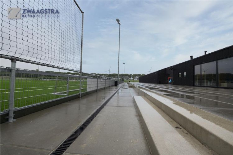 Op het gehele sportpark liggen betonplaten van Zwaagstra Beton. 'Voor de uitstraling is gekozen voor platen van twee bij een meter', licht Groeneveldt toe. 'Dat oogt het mooiste. De toplaag is voorzien van een richtingloze antislipstructuur. Zo is het onder alle weersomstandigheden veilig om hier te lopen.'