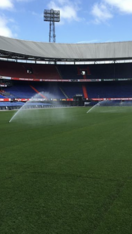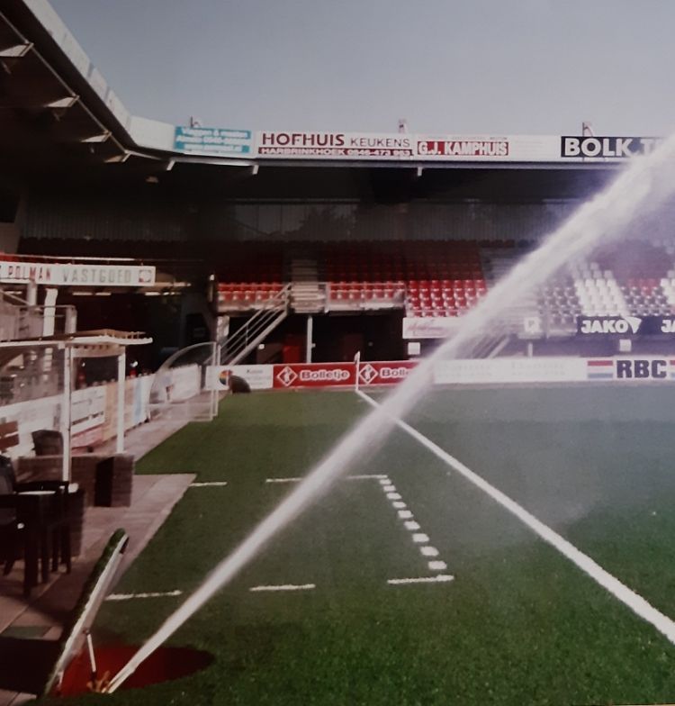 | | Mölder: 'Ik bedacht een oplossing voor de beregening van het eerste kunstgrasstadionveld, op basis van die grote beregeningskanonnen uit de landbouw.' |