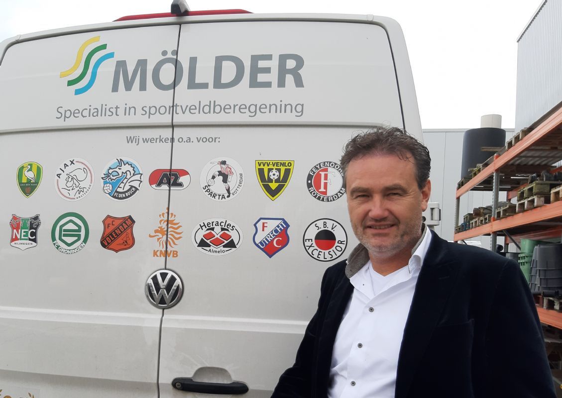 Andere wereld Na twee jaar beregeningsinstallaties in particuliere tuinen te hebben aangelegd, schakelde hij volledig over op de markt voor sportveldberegening. 'Ik vond het enorm leuk dat ik in de sportveldenwereld te maken had met professionele partijen, zoals aannemers, sportclubs en gemeenten - compleet anders dan de particuliere markt', vertelt Mölder. 'Bovendien houd ik van sport en van de sportwereld.' Mölder Sportveldberegening B.V. werkt landelijk en af en toe in het buitenland. Klanten zijn aannemers, sportverenigingen en gemeenten.