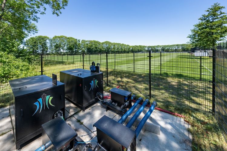 Het systeem bestaat uit een pomp, een put en drainbuizen op 1,40 meter afstand van elkaar onder het gras. Dat gras krijgt via die drainbuizen ook het water aangevoerd. Dankzij capillaire werking trekt het vanaf de drainbuizen omhoog naar de wortels. 'De wortels gaan tegelijkertijd het water beneden opzoeken,' zo licht Lucas Servaas van De Ridder toe. Samen met zijn vaste onderhoudsman op het complex, Luuk van den Breemer, en Rudolf Molenaar van Draintalent geeft hij in het nagelnieuwe clubgebouw een toelichting op het project waar het innovatieve Draintalent-systeem zich in de praktijk mag bewijzen.