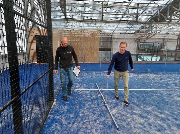 Op de dag in oktober waarop keurmeester Nico van Aken van Kiwa Isa Sport bij ZuitNL aantreedt voor de officiële keuring, is commercieel directeur Michel de Krieger van Rekre Sport zijn gastheer. En ook van Fieldmanager, voor deze gelegenheid. De hoogste verdiepingen van het sportcentrum in Etten-Leur, waarvan onder meer ook bowlingbanen en een sportschool deel uitmaken, zijn gereserveerd voor tennis en padel. In navolging van de populariteit van de sport in de VS is er ook nog een zogeheten pickleball-baan bij gelegd. Pickleball is een balsport die in de VS in opmars is en zich ook in Nederland ontwikkelt. De eerste spelers die het pickleball-veld betraden bij Zuit, reageerden volgens De Krieger enthousiast. Vier padelbanen zijn al in gebruik; de vijfde wordt vandaag gekeurd. Op alle banen glinstert het instrooizand nog op de blauwe kunstgrasmatten. Het zal er tijdens het gebruik snel worden ingelopen. Op banen waar al een paar keer is gespeeld, is mooi te zien waar dat het snelst gebeurt: daar waar het meest wordt gelopen. 'Mede daarom moet het kunstgras regelmatig worden onderhouden', verklaart De Krieger. 'Dan wordt het zand herverdeeld over de baan.'