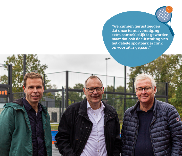 Hooijer, Lolkema en Soet blikken positief terug op de realisatie van de padelbanen. Soet: 'Toen we dit voorjaar startten met de bouw, hoopten we dat we de padelbanen nog dit jaar zouden kunnen gebruiken. Tegelijk wisten we dat dat wel wat ambitieus was. Maar met dank aan de plezierige samenwerking met Antea Sport, in het bijzonder met hoofduitvoerder Derk Kuiper, is dat toch gelukt. Omdat de communicatie soepel verliep en Antea Sport de planning strak in de gaten hield, konden we de banen begin oktober feestelijk openen. We kunnen gerust zeggen dat onze tennisvereniging extra aantrekkelijk is geworden én dat de uitstraling van het gehele sportpark er flink op vooruit is gegaan.'