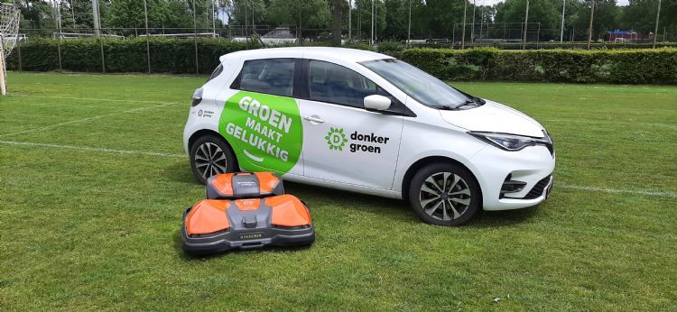 Donker Groen kreeg in voorjaar 2021 het contract van de gemeente Dronten gegund om de sportvelden te beheren. De gemeente legde daarin de nadruk op duurzaamheid en daarop focust de opdrachtnemer zich ook. Meteen na aanvang van het contract zette Donker Groen maairobots in op de voetbalvelden van Swift '64 in Swifterbant. Het betrof de Husqvarna Automower 550 EPOS. Hiervan werden er twee per sportveld ingezet. Deze proef breidde Donker Groen uit naar de velden van asv Dronten. Daar doet de nieuwste robotmaaier van Husqvarna, de Ceora 546 EPOS, sinds dit voorjaar zijn werk. De machine kreeg een centraal gelegen oplaadpunt en een referentiestation op 15 meter hoogte aan een lichtmast. Marc Dingemans is calculator bij Donker Groen en hij begeleidt beide projecten: 'Voor ons vormt dit een uitdaging om het kostendekkend te maken,' vertelt hij. 'Op de Swifterbantse voetbalvelden is een vrijwilligersploeg betrokken bij het veldonderhoud en het terrein eromheen. Ze doen daar ook het onderhoud aan onze robotmaaiers, zoals reinigen en messen vervangen. Op de Drontense velden is het maaien en het onderhoud volledig onze verantwoordelijkheid. De Ceora 546-maairobot heeft een tienmaal zo hoge capaciteit als de robotmaaiers in Swifterbant: 50.000 vierkante meter. Ook biedt hij een mooie innovatie. Naast parallelle banen kan hij namelijk in patronen maaien.' Van die laatste optie maakt Donker Groen zeker gebruik en dat heeft een reden. Dingemanse: 'De machine maait zijn banen van buiten naar binnen. Laat je hem een veld in banen in de breedte maaien, dan slaat hij bijvoorbeeld tussen de doelpalen het gras over. De maaier draait om en gaat vervolgens aan zijn volgende baan verder Het stuk dat niet is gemaaid, probeert hij aan het einde van zijn ronde via de andere kant van het veld te maaien. Datzelfde gebeurt als er bijvoorbeeld twee bankjes of pionnen achter elkaar op een (trainings)veld achterblijven. Maaiend in een blokpatroon pakt hij dat stukje tussen de doelpalen wel mee, omdat hij de ene keer in de lengte en de andere keer in de breedte maait. Je moet overigens goed opletten met de doelnetten. Een neergeklapt doelnet signaleert de machine namelijk, nog, niet voldoende. Maar daarmee ben ik wel aan het experimenteren, met een aanbrengen van een markering. Ik heb ervaren dat je de marges zo ruim mogelijk moet aanhouden bij het uitzetten van de grenzen van het maaiveld. Ook laten we onze robotmaaier het trainingsveld niet maaien. Wanneer daar te veel obstakels als losse trainingsdoelen achterblijven, kunnen we met deze maaimethode geen goed resultaat garanderen.'