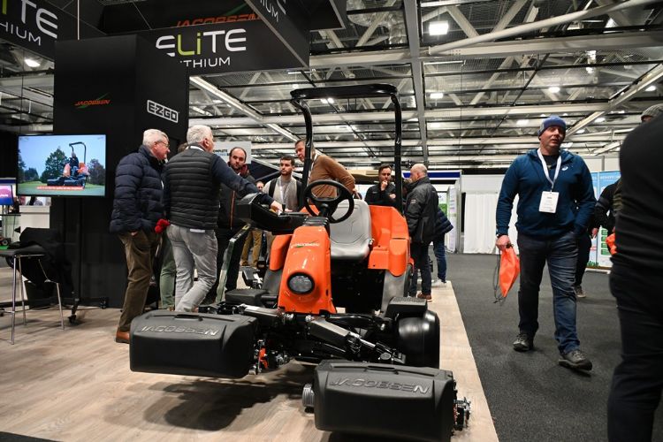 Op groene vakbeurzen bestaat de hoofdmoot tegenwoordig uit een overvloed aan accumachines, zoals deze Jacobsen SLF 1, een volledig elektrische fairwaymaaier. Deze machine is volledig zonder hydrauliek uitgevoerd.