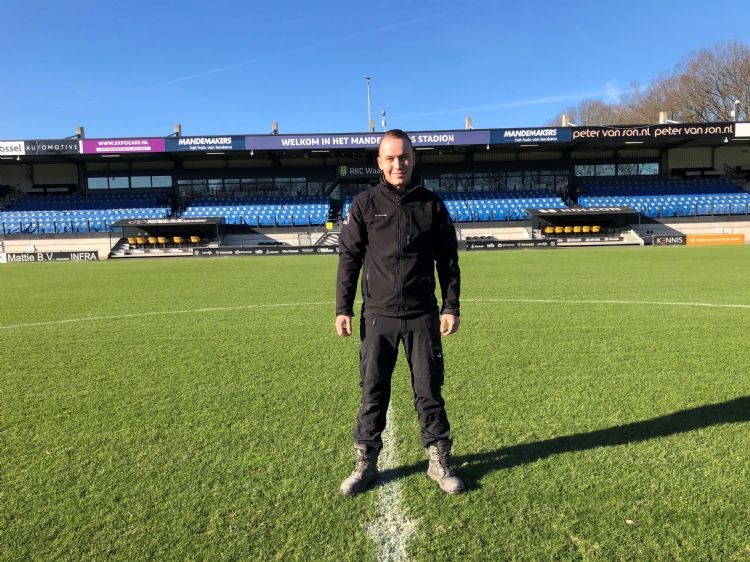 Ook voor de jonge Thimo de Nijs ging een nieuwe wereld open, toen hij in 2019 in dienst trad bij de betaaldvoetbalorganisatie in Waalwijk. Als zoon van het huidige hoofd facilitaire zaken wist hij wel van het bestaan van dit beroep, want zijn vader was jarenlang verantwoordelijk voor het onderhoud van de RKC-velden, in samenwerking met aannemersbedrijf Van Wijlen. Wat het vak precies inhield, leerde hij vooral in de praktijk. 'Ik wilde eigenlijk het leger in, maar kwam er snel achter dat de defensie-opleiding niet bij mij paste. Ik wilde graag zelf iets neerzetten en leidinggeven. Mijn vader vroeg me toen om bij RKC te komen werken om te ontdekken of dit werk bij mij paste.' Hij begon met technisch onderhoud, het schoonmaken van het stadion na een thuiswedstrijd en ondersteunende werkzaamheden bij het grasonderhoud. 'Ik ging steeds meer doen, zoals herstelwerkzaamheden, maaien en onderhoud uitvoeren met verschillende machines. Ik had niet verwacht dat ik dit, zomaar uit het niets, zo mooi en leuk zou vinden. Ik dacht altijd: ach, gras onderhouden kan toch iedereen, dat is niet zo moeilijk. Maar ik heb mij vreselijk vergist', lacht hij.