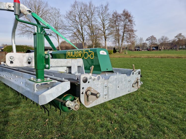 De eg is de afgelopen tijd getest op de Major Swift 240, het meest verkochte model voor sportvelden. De eg is net zo breed als de effectieve werkbreedte van de machine: 2,40 meter. Hij is omhoog verstelbaar, zodat een maaironde zonder eg ook mogelijk is. Ook de intensiteit van de eg is in te stellen: tussen de sprieten door of juist diep en agressief, zodat hij door de bovenlaag van de grasmat trekt. Elke bestuurder kan met de extra eg overweg, stelt Ballast. 'Als een machinist alleen maar maait, is dat vaak een kwestie van rondjes draaien. Dat is niet moeilijk. Als je die ronde kunt combineren met andere nuttige werkgangen, zoals eggen of rollen, is dat natuurlijk een enorme meerwaarde voor de machine.' Op testlocaties met het prototype werd als groot voordeel gezien dat de machine zowel tegen onkruid als tegen viltvorming effectief is.