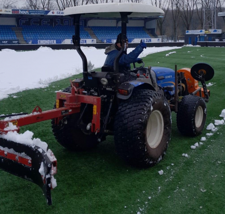 In het profvoetbal wordt altijd alles geprobeerd om wedstrijden te laten doorgaan. Na de sneeuwval in januari van dit jaar (2023, red.) heeft CSC de velden van FC Eindhoven en Excelsior dan ook op verzoek sneeuwvrij gemaakt. Dit betekent al snel zes uur werk voor de CSC-onderhoudsploeg. Er wordt dan een sneeuwschuiver met rubber flappen gebruikt. Geres: 'Het moet altijd verantwoord zijn voor het kunstgras. We doen het met beleid, maar uiteindelijk schuif je altijd een beetje infill mee. Later wordt dit wel weer hersteld.' Het karwei kost zoveel tijd omdat de sneeuw niet alleen van het veld moet, maar ook het stadion uit gereden moet worden met shovels.