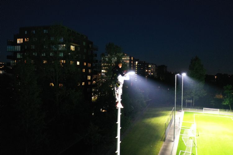 | | Een Dark Licht-installatie verlicht het veld. Omdat de omgeving niet langer mee wordt verlicht, neemt het elektriciteitsverbruik verder af |