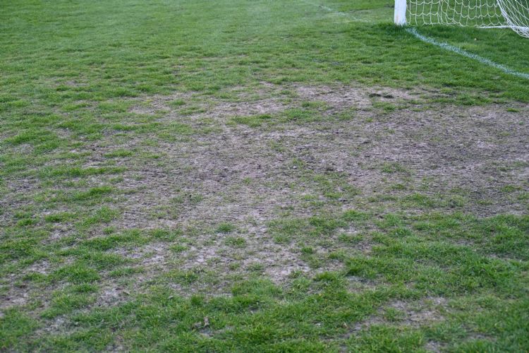| | Speelschade in het doelgebied, maar er komt alweer nieuw gras op. |