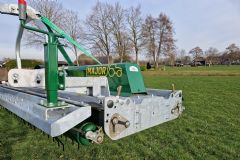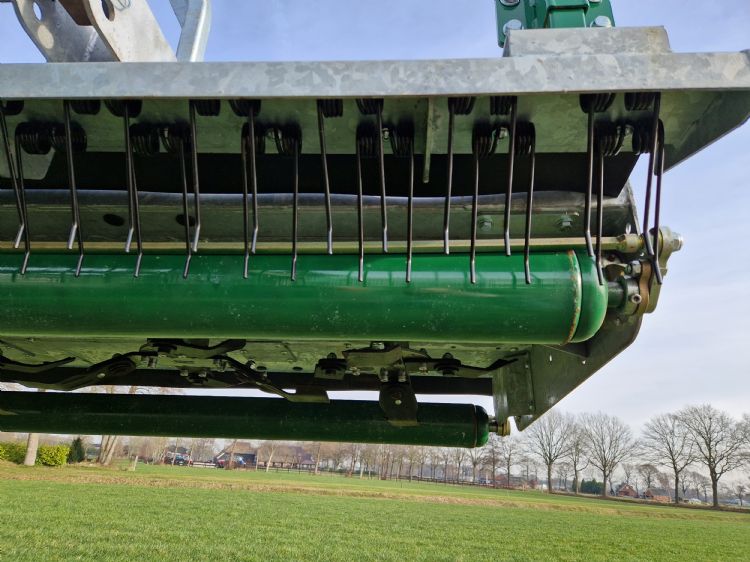 Eerst haalt de eg de sprieten omhoog, inclusief veel onkruiden. Vervolgens gaat de cirkelmaaier hier overheen. De achterrol zorgt vervolgens voor een mooi beeld. De Major Swift is dus een drie-in-eenmachine. De eg is net zo breed als de effectieve werkbreedte van de machine: 2,40 meter. Hij is omhoog verstelbaar, zodat een maaironde zonder eg ook mogelijk is. Ook de intensiteit van de eg is in te stellen: tussen de sprieten door of juist diep en agressief, zodat hij door de bovenlaag van de grasmat trekt.
