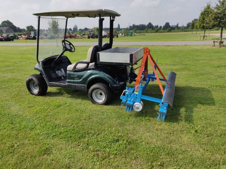 Naast deze twee zeroturnmaaiers, is er op deze dag ook een door Rein Drost bedachte combinatie te bewonderen om kunstgras te onderhouden. Als importeur van golfkar Yamaha Course Mate, heeft Rein Drost deze elektrische golfkar gekoppeld aan een borstel, de GKB Quick-Brush met een werkbreedte van twee meter. Het resultaat: een elektrische borstelcombinatie met een lichte voetafdruk. Deze combinatie kan ingezet worden voor onderhoud op alle soorten kunstgrasvelden.