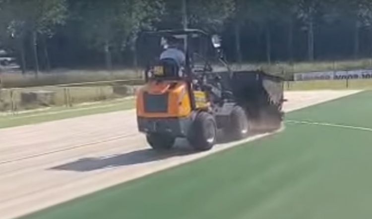 J&E Sports heeft in samenwerking met het bedrijf Aanlegkunstgrasvelden.nl van Boy van Leur een zandstrooier bedacht die door een elektrische bulldozer aangedreven wordt. Deze machine is onlangs voor het eerst gebruikt, zoals te zien is in onderstaande video.