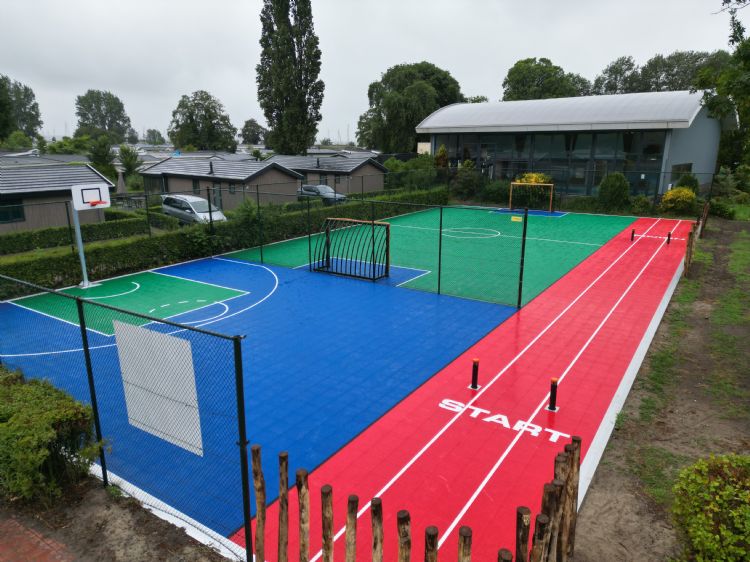 Een eerste W&H-court is inmiddels gebouwd bij EuroParcs De Biesbosch, in samenwerking met en in opdracht van Boerplay (zie foto). Bij het UMC Utrecht worden dezelfde tegels gebruikt voor de aanleg van een Cruyff Court. Ook bij nat weer kan er altijd gesport worden op deze kleurrijke ondervloer, want de tegels zijn waterdoorlatend. 'En ze zijn onderhoudsarm,' zo besluit Van Diemen.