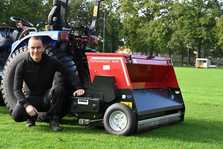 Sinds ruim een jaar staat er een Redexim Speedseed 1500 voor gebruik gereed in de loods van RKC Waalwijk. De Nijs: 'We koppelen hem aan een Iseki-tractor. De versnellingsbak die het zaaddistributiesysteem regelt, wordt aangedreven door een smalle band aan de linkerzijde van de machine. Die staat net iets breder dan de banden van een compacttractor. Op dit niveau is het een compacte machine met een grote zaadbak. De voorrol is voorzien van spikes en de achterrol is glad. Beide vragen weinig onderhoud. Die voorrol bestaat uit afzonderlijke ringsecties waarvan de noppen conische perforaties maken in de toplaag. Het graszaad wordt hier met precisie in gelegd. Daarbij veegt een statische kunststof borstel het eventueel gemorste zaad in de gaten. Deze worden vervolgens met de achterrol dichtgedrukt, zodat het zaad kan kiemen. Wij werken met een enkele rol, maar er bestaat ook een versie met een extra rol met noppen. Daarmee verdubbel je het aantal gaten en benut en verdeel je het graszaad nog beter. Onze machine maakt ongeveer 1.000 conische gaten per vierkante meter.'