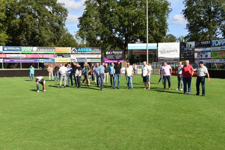 Gedurende de lunch kwam ik in gesprek met twee van de totaal veertien vrijwilligers bij sv Gramsbergen. 's Maandagsochtends komen ze allemaal bijeen in de kantine, voor overleg over de grote variëteit aan werkzaamheden die ze voor hun rekening nemen. Zelfs een timmerman maakt deel uit van de vrijwilligersploeg. Het maaiwerk is in handen van de gemeente Hardenberg, maar het wiedeggen tegen onkruid voert de club bijvoorbeeld weer zelf uit. De beregening is in eigen beheer geheel geautomatiseerd. Vrijwilliger Gerrit Kelder, die de beregeningsinstallatie beheert, speelde hierin een belangrijke rol. Kelder: 'De velden zijn in eigen beheer met gebruikmaking van een aangepaste woelpoot voorzien van beregeningsstrengen. We hebben ook zelf de pop-upsprinklers geïnstalleerd. De strengen kwamen hierbij op een diepte van 45-60 cm te liggen. Het was enorm leuk om zo'n immense klus met elkaar als vrijwilligers aan te pakken. Gezelligheid is troef bij onze vrijwilligers. Jaarlijks organiseren we twee vrijwilligersavonden met partners, totaal circa 100 man. Onze gebouwen zijn al gasvrij; wij werken met zonneboilers op het dak en hebben een warmwaterreservoir van ruim 5.000 liter.'