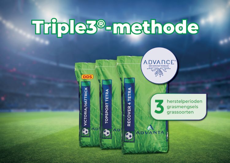 Klimaat, Green Deal en toenemende bespelingsdruk vragen om een andere aanpak van het veldonderhoud. Advanta introduceert daarom de Triple3-methode voor toekomstbestendige sportvelden. Daarbij benut je niet alleen de periode van groot onderhoud, maar ook het voor- en najaar voor structureel herstel. Zaai door met één van de 3 Advance-speciaalmengsels en profiteer van de synergie tussen 3 grassoorten: tetra- en diploïd Engels raaigras én veldbeemdgras. Het resultaat: jaarrond een vitale, weerbare en dichte mat die meer speeluren aan kan. Kom langs in stand 2.3.05 en bespreek wat Triple3 voor jouw sportveld kan betekenen.